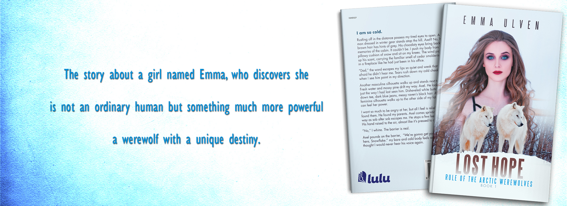 Emma Ulven has had a passion for telling stories, writing them on paper, since she was really young. Her journey as an author began at age 13, bringing her first book Lost Hope to life on Wattpad.